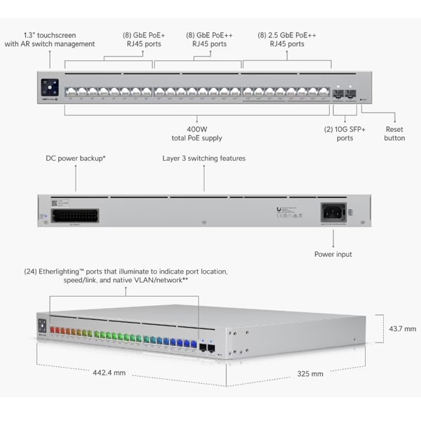 • A 24-port, Layer 3 Etherlighting™ switch with 2.5 GbE and PoE++ output. • Etherlighting™ ports that illuminate to indicate port location, speed/link, and native VLAN/network* • (8) 2.5 GbE PoE++ ports • (16) GbE ports including (8) PoE+ and (8) PoE++ • (2) 10G SFP+ ports • DC power backup ready • 400W total PoE availability • Managed with UniFi Network 8.0.24 and later • LCM display 1.3" Touchscreen • Total non-blocking throughput 56 Gbps *Pair with UniFi Etherlighting Patch Cables for optimal brightness. |