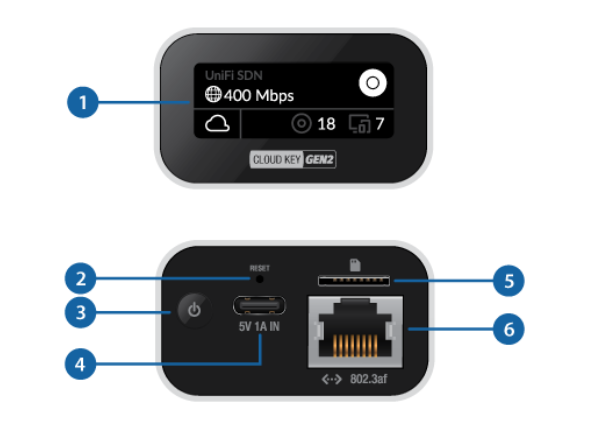 ภาพแสดงสถานะการทำงานและช่องเชื่อมต่อต่างๆ ของ Ubiquiti UCK-G2 (UniFi Cloud Key Gen2) ตามหมายเลขดังนี้